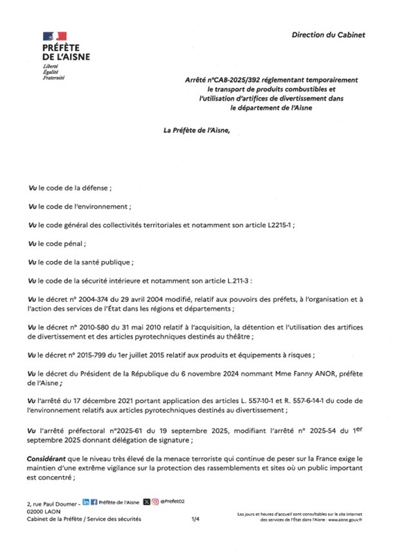 La Préfecture de l’Aisne a pris un arrêté portant sur la réglementation temporaire du transport de produits combustibles et l’utilisation d’artifices de divertissement dans le département de l’Aisne pour la période du mardi 30 décembre 2025 à 08h00 au vendredi 2 janvier 2026 à 08h00.Retrouvez l’arrêté préfectoral ci-dessous.