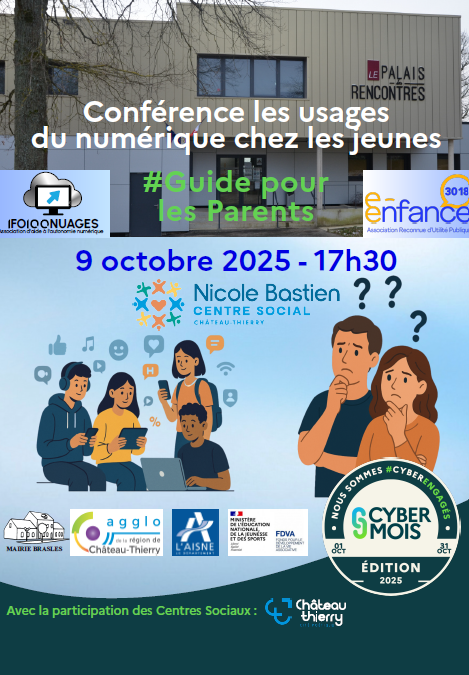 Jeudi 9 octobre à 17h30, dans le cadre du Cybermois, l’association 1FO100nuages et les centres sociaux de la Ville de Château-Thierry organisent une conférence autour des usages du numérique chez les jeunes, avec Mme Yasmine Hamoum de l’association e-Enfance/3018.