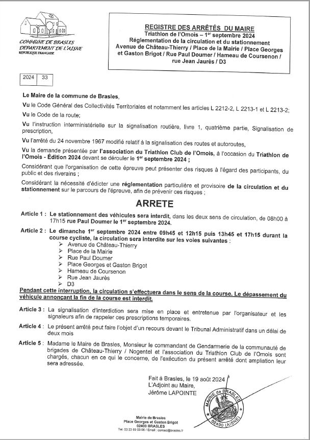 Accueil Commune de BRASLES > Actualités : Triathlon de l’Omois : règlementation de la circulation et du stationnement
